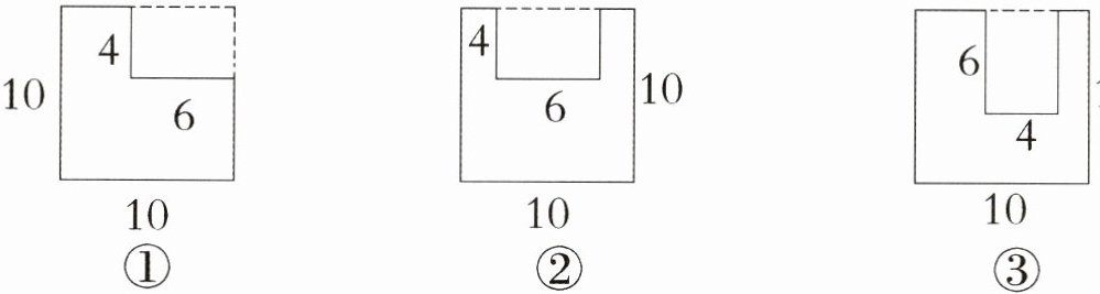 2. 如图,从边长是 10 厘米的正方形纸上,剪去一个长是 6 厘米、宽是 4 厘米的长方形。剩下部分的面积和周长分别是多少? (18 分)(单位:厘米)