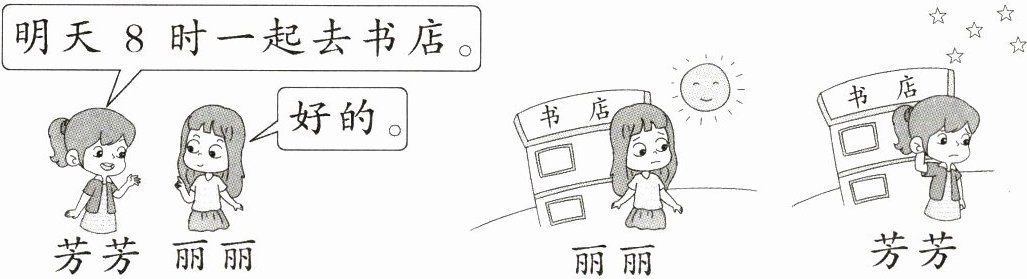 一天中有两个8时,分别是上午8时和晚上8时。芳芳和丽丽相约8时去书店,却没有约定是上午还是晚上。丽丽以为是上午8时,而芳芳以为是晚上8时,因此两个人在书店门前都找不到对方。(答案合理即可)