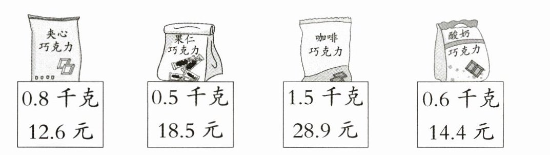 (1)1.5 千克>0.8 千克>0.6 千克>0.5 千克 答:果仁巧克力最轻,咖啡巧克力最重。