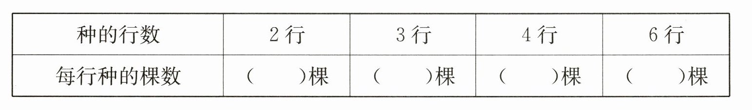 观察上表可以发现:总棵数不变,种的行数越( 多 ),每行种的棵数越( 少 )。