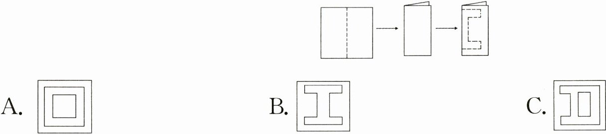 6. 新素养 空间观念 如图,将一张正方形纸对折之后,剪掉虚线部分,展开后的图形是( )。