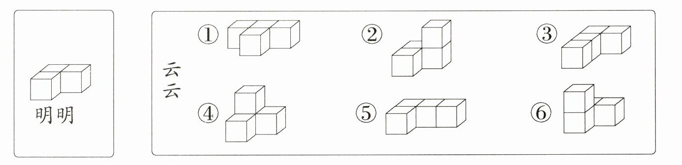 2. 如图,再添上一个同样的小正方体,云云就把明明搭的积木变成了 6 种不同的形状。(填序号)