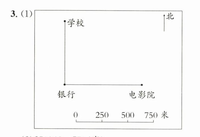 3. (1)学校在银行正北方向625米处,请你在图上标出学校的位置。(4分)