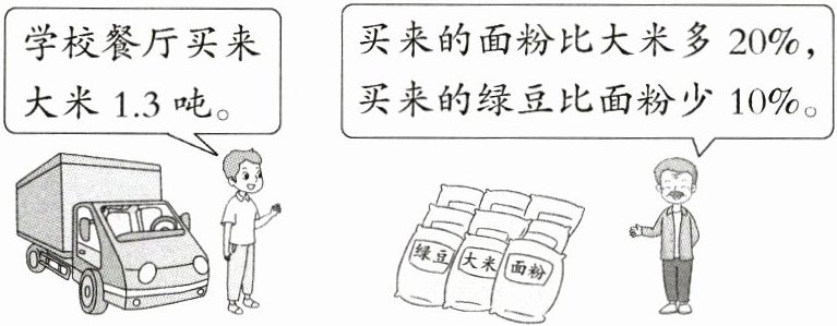 学校餐厅买来大米1.3吨。买来的面粉比大米多20%,买来的绿豆比面粉少10%。