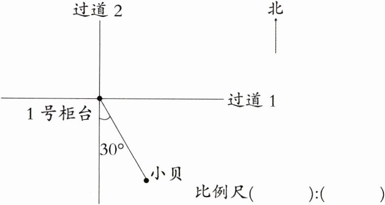 (此处有图,过道2在上方,北在右上方,过道1在右方,1号柜台在中间,小贝在1号柜台右下方与竖直方向夹角30°处,比例尺