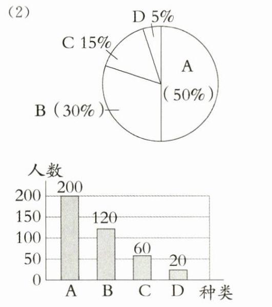 2.(新情境 人文积淀)端午节在每年农历五月初五,自古以来端午节便有赛龙舟及食粽等节日活动。某食品厂为了了解消费者对去年销量较好的豆沙粽子、红枣粽子、鲜肉粽子、蛋黄粽子(分别用A、B、C、D表示)的喜爱情况,对消费者进行了抽样调查,并将调查结果绘制成如下两幅不完整的统计图。