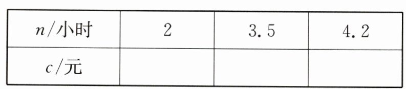 1. 服装公司用公式$c = 10 + 12n$来计算成本。$c$表示成本,$n$表示做一件服装所需要的时间。试根据公式填写下表。(6分)