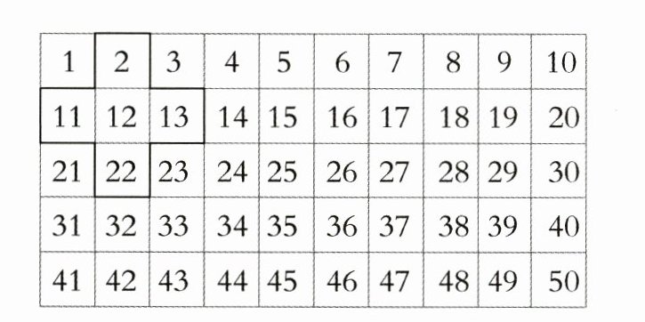 (2) |1|2|3|4|5|6|7|8|9|10| |----|----|----|----|----|----|----|----|----|----| |11|12|13|14|15|16|17|18|19|20| |21|22|23|24|25|26|27|28|29|30| |31|32|33|34|35|36|37|38|39|40| |41|42|43|44|45|46|47|48|49|50| 框中的5个数的和是180,如图所示。如果框中的数的和是100,那么中间的数是$100÷5 = 20$。因为20在边上,所以无法框中。