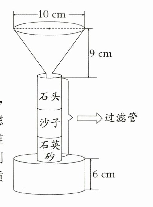 12. 新素养 几何直观 安安自制了一个污水过滤器进行污水过滤实验,如图所示。将污水倒入上方的近似圆锥形容器内,经过过滤管的过滤后,清水滴入下方的圆柱形容器(与圆锥形容器底面相同)。这个圆锥形容器一次能装入( )mL的污水。如果这些污水全部过滤到如图圆柱形容器中,水的高度是( )cm。(不考虑过滤掉的杂质的体积)