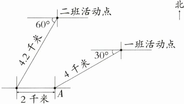 (2)二班从A点出发先向西步行2千米,再向北偏东30°方向步行4.2千米到达二班活动点。