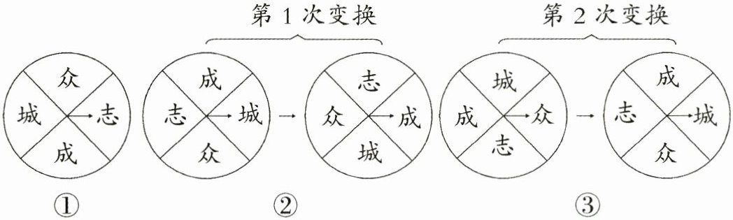 5. 辨思维 逻辑推理 有一个四等分的转盘,上、右、下、左的位置分别写着“众、志、成、城”,如图①。若将上、下位置的两个字对调,同时将左、右位置的两个字对调,再将转盘顺时针旋转90°,则完成一次变换。如图②③分别表示第1次变换和第2次变换的过程。那么按上述规则完成第9次变换后,“众”字在转盘中的位置是在哪儿?(5分)