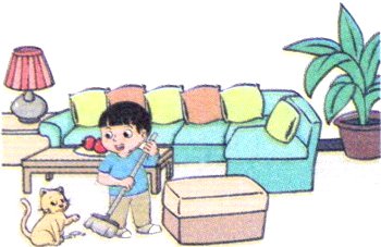 1. 在客厅里 2. 在垫子上 3. 在玩扫帚