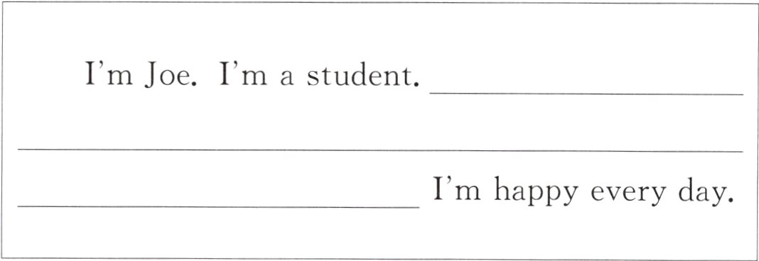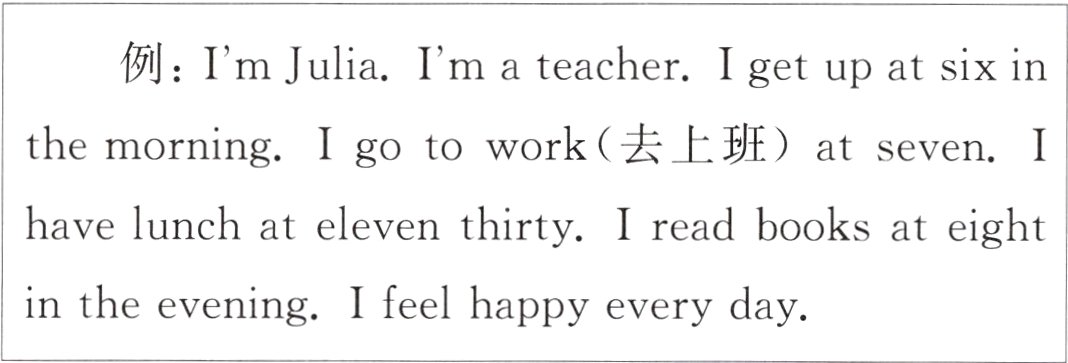 例:I’m Julia. I’m a teacher. I get up at six in the morning. I go to work(去上班)at seven. I have lunch at eleven thirty. I read books at eight in the evening. I feel happy every day.