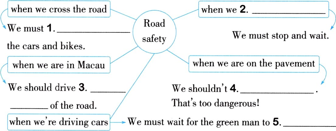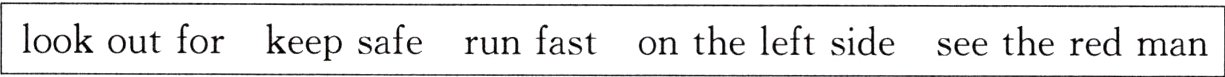 1. look out for 2. see the red man 3. on the left side 4. run fast 5. keep safe