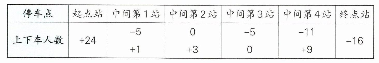 3. (德州夏津县期末)一辆汽车从起点开出后,经过4个停车点,最后到达终点站。下表记录了该汽车的载客数量的变化情况。(上车用正数表示,下车用负数表示)