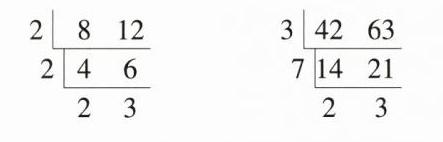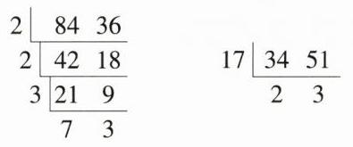 $8和12的最大公因数是:2\times2 = 4。 42和63的最大公因数是:3\times7 = 21。84和36的最大公因数是:2\times2\times3 = 12。 34和51的最大公因数是17。$