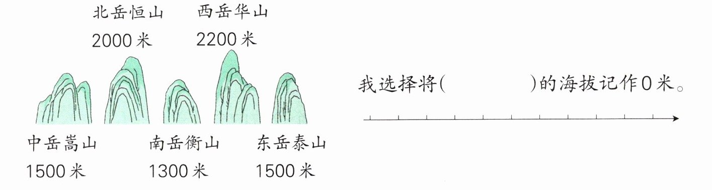 1. 登过崂山后,爸爸妈妈打算带萱萱游览“五岳”。下面是“五岳”的近似海拔,请你将其中一座山的海拔记作0米,用正负数在直线上标出“五岳”的海拔。