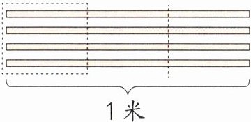 2. [教材改编](1)把4条1米长的绳子平均分成3份,拿走其中一份(如图)。看图思考:拿走的是( )个$\frac{1}{(\ \ \ \ \ )}$米,也就是$\frac{(\ \ \ \ \ )}{(\ \ \ \ \ )}$米。