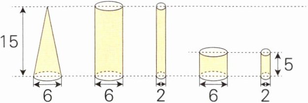2. 茶桶的形状丰富多彩。下图中有( )个圆柱形茶桶的体积和左边圆锥形茶桶的体积相等。(单位:厘米)