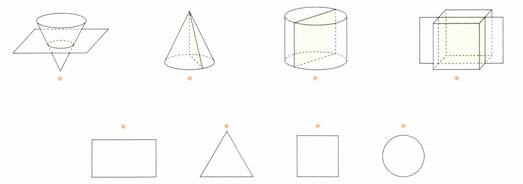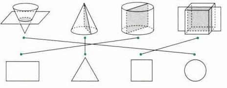 1. 把下面的物体用一个平面切成两部分,截面是什么样的图形?请你连一连。