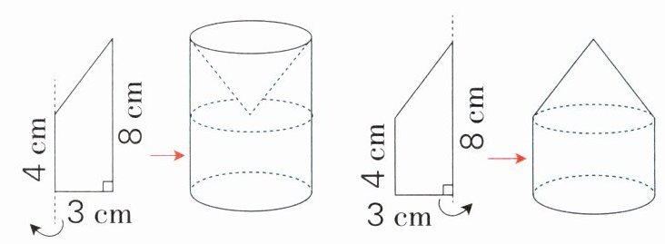 4. 分别以直角梯形的上底和下底所在的直线为轴,将直角梯形旋转一周,得到两个立体图形。两个立体图形的体积相差多少?