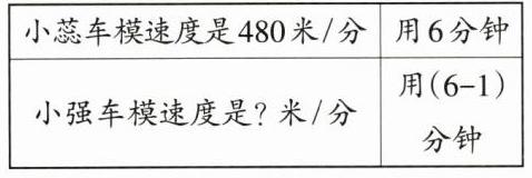 3. (潍坊高密市期末)学校举行车模比赛,小蕊的车模速度是 480 米/分,跑完全程用了 6 分钟,小强的车模跑完全程比小蕊的少用了 1 分钟,小强的车模速度是多少?(先列表分析题意,再用比例知识解答)