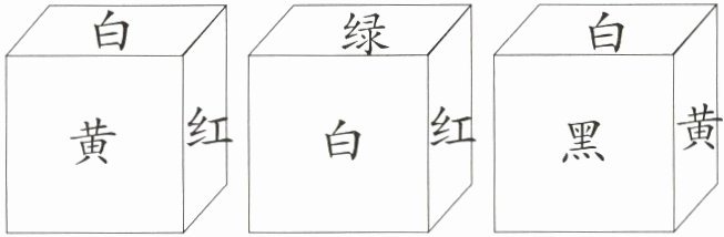 2. 有一个正方体,每个面的颜色都不同,分别是白、蓝、黄、红、绿、黑,从不同方向观察的结果如下图,这个正方体相对两个面的颜色各是什么?(7分)