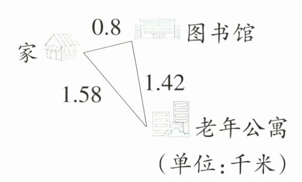 (2)1.42 - 0.8 = 0.62(千米) 答:他从家到图书馆比从图书馆到老年公寓少走0.62千米。