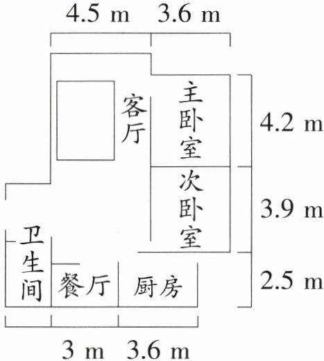 (2)请根据主卧室的实际长和宽,求出平面设计图中主卧室的面积。(4分)