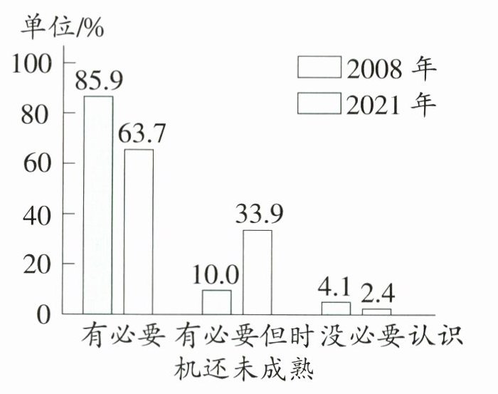 (2)2008 年认为垃圾分类有必要但时机还未成熟的占( ),2021 年认为垃圾分类有必要但时机还未成熟的占( ),由此看来,垃圾分类的时机( )。