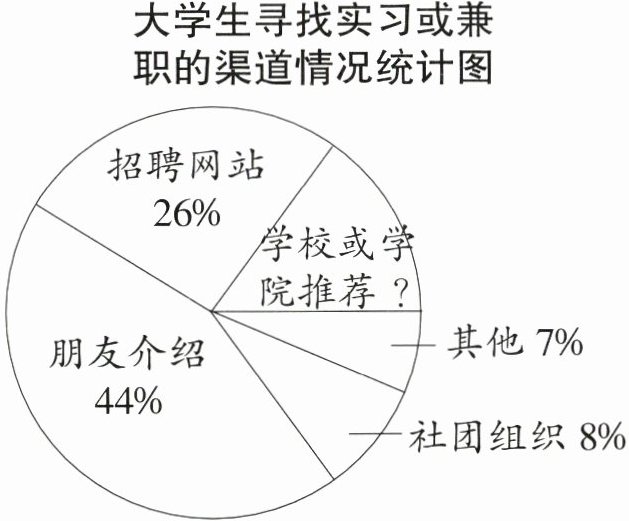 (1)由学校或学院推荐寻找实习或兼职的大学生人数占总调查人数的百分之几? (6 分)