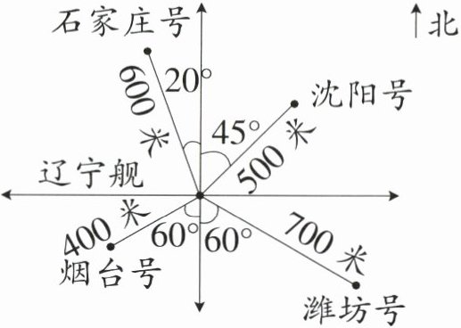 (1)石家庄号在辽宁舰的北偏( )( )°方向,距离辽宁舰( )米。