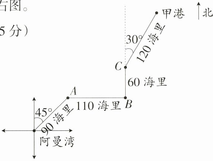 (1)油轮从阿曼湾出发,先向北偏东45°方向航行90海里到A点,再向东航行110海里到B点,再向北航行60海里到C点,最后向北偏东30°方向航行120海里到甲港。