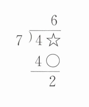 思路导引:商和除数是已知的,根据乘法口诀“六七四十二”可以得出〇代表2。再由4☆−42 = 2,推出☆代表4。