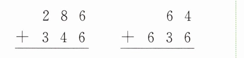 6. (开放题)用6张卡片组成两个三位数,使它们的和是1000。(至少写出两道算式)