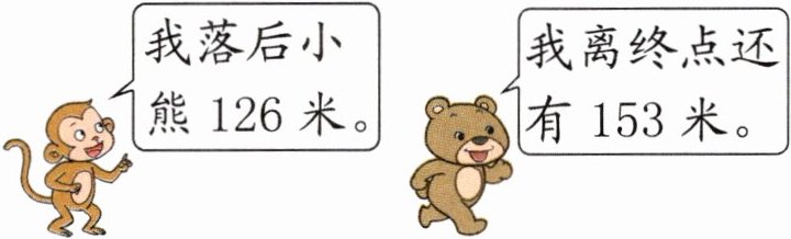 思路导引:要求小猴已经跑了多少米,可以用总路程减去小猴离终点的路程。由题意可知,从体育场到游泳池的总路程是800米,而小猴离终点的路程要用小熊离终点的路程加上小猴落后小熊的路程。还可以先算出小熊已经跑的路程,由“小猴落后小熊126米”,可知小猴比小熊少跑了126米,用小熊已经跑的路程减去126米即可。