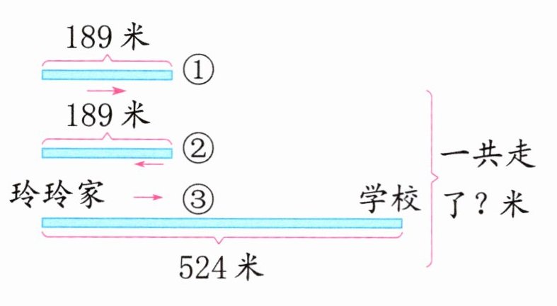 思路导引:玲玲走出189米后又返回家中,来回一共走了2个189米,然后从家到学校又走了524米。524米与之前走的路程合起来,就是她今天上学一共走的路程。如下图,列式为$189 + 189 + 524$。