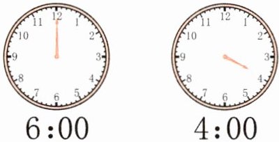 思路导引:第一个钟面的时间是6:00,分针应指着12,时针应指着6,钟面上缺少时针(即短针)。第二个钟面的时间是4:00,分针应指着12,时针应指着4,钟面上缺少分针(即长针)。