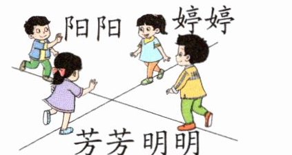 例题 如图,明明往西走,阳阳往( )走,婷婷往( )走,芳芳往( )走。