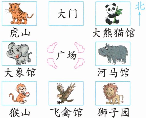 (3)虎山在广场的( )面,广场的( )面是大熊猫馆。