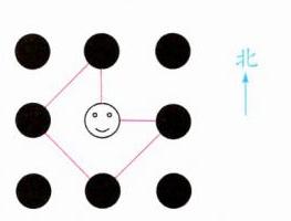 2. 下面是月月爸爸的手机锁屏密码(手势密码):从 ☺ 开始,先向北连1格,然后向西南连1格,再向东南连1格,接着向东北连1格,最后向西连1格。请根据要求连一连。(15分)