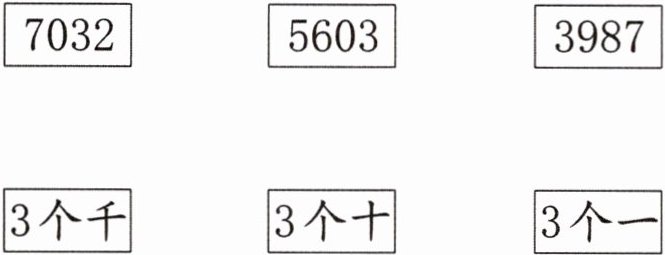 思路导引:7032中的“3”在十位上,表示3个十;5603中的“3”在个位上,表示3个一;3987中的“3”在千位上,表示3个千。