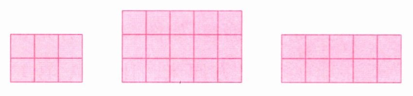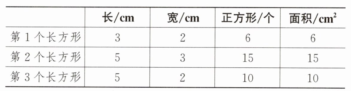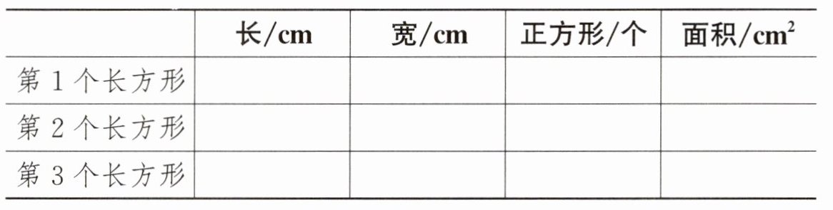 [教材第66页例4] 小组合作,用几个1平方厘米的正方形摆出3个不同的长方形,并填写下表。