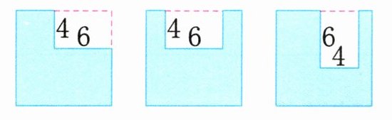 6.(创新题)在一个边长1分米的正方形中,剪去一个长6厘米、宽4厘米的长方形,小明想到了三种方法(如图,单位:厘米)。剩下部分的面积是多少? 剩下部分的周长又是多少?
