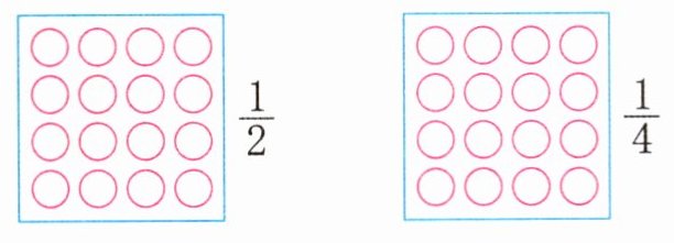 4.(难点题)一堆圆片有16个,分别圈出这些圆片的$\frac{1}{2}$和$\frac{1}{4}$。你还能圈出它的几分之一?填一填,圈一圈。
