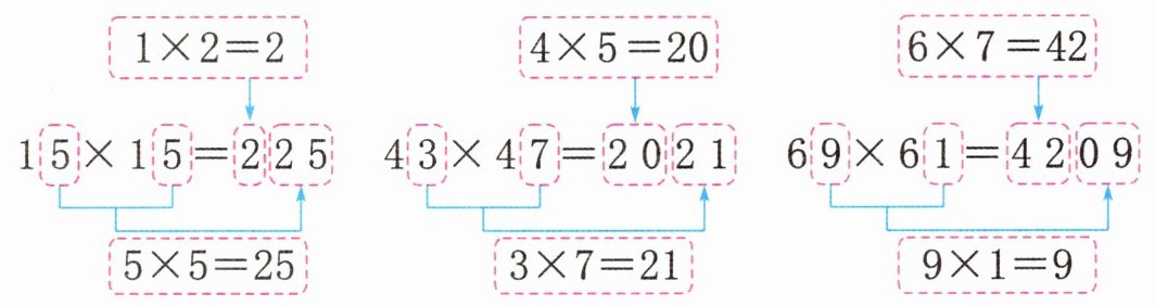 知识归纳:两个乘数十位上的数相同,个位上的数相加等于10的乘法的规律:乘积的末两位是两个乘数个位上的数的乘积(个位上的数相乘不满10的,在积的十位上用0占位),积的末两位前面的数是乘数十位上的数与比它大1的数的乘积。