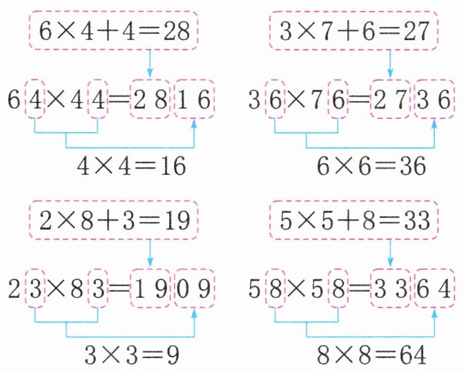 (2)积的末两位前面的数是两个乘数十位上的数相乘的积与一个乘数个位上的数之和。