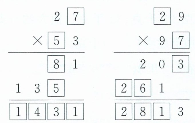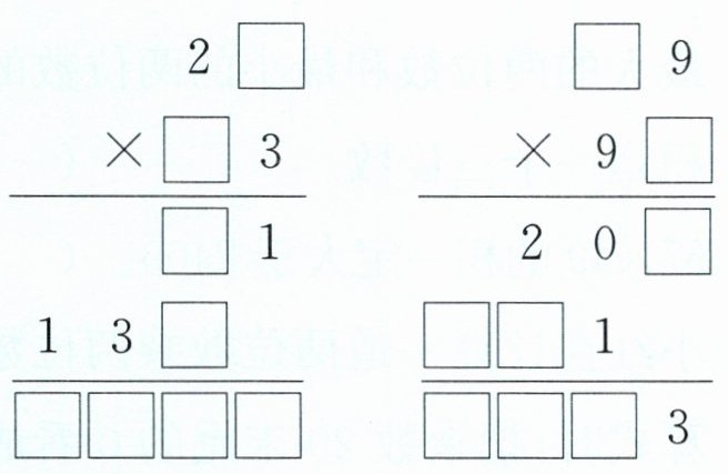 第2道题,先根据得数个位上是3,确定第一次乘得的积的个位上也是3,由此确定第二个乘数的个位上是7,再根据第一次乘得的积的前两位是20,想:7×9=63,向十位进6,$\square$×7+6=20,所以第一个乘数的十位上是2,最后逐步填出其他$\square$里的数字。