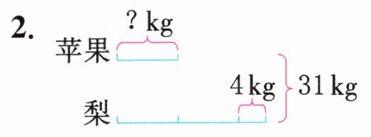 @@2. 31 - 4 = 27(kg) 1 + 2 = 3(份) 27÷3 = 9(kg)