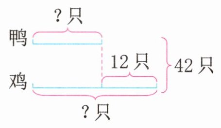 由上图可知,鸭的只数的2倍是42 - 12 = 30,先求出鸭的只数,再求出鸡的只数。也可以这样想:鸭的只数加上12就和鸡一样多,也就是鸡的只数的2倍是42 + 12 = 54,从而求出鸡的只数,进而求出鸭的只数。